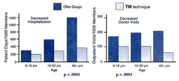 In addition to rapid improvement in psychological health, regular experience of Transcendental Consciousness also produces marked benefits for physical health. A five-year study of insurance statistics on 2,000 people throughout the U.S. who regularly practiced the Transcendental Meditation program found that their overall rate of hospitalization was 56% lower than the norm. The decreases were highly significant in the most serious conditions, including 76% less hospitalization for major surgery, 55% less for cancer, and 87% less for heart disease and stroke.