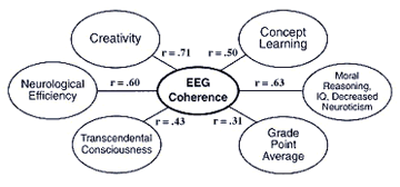 Higher levels of EEG coherence measured during the experience of Transcendental Consciousness are significantly correlated with a wide range of mental and psychological improvements. The four studies included in this chart indicate that the enlivenment of total brain functioning during the fourth state of consciousness results in increased fluency of verbal creativity, increased efficiency in learning new concepts, more principled moral reasoning, higher verbal IQ, decreased neuroticism, higher academic achievement, clearer experiences of pure consciousness, and increased neurological efficiency, as measured by faster recovery of the H-reflex.