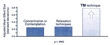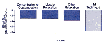 Anxiety is a psychological measure of an individual’s level of inner peace—or lack thereof. If Transcendental Consciousness is indeed a state of inner peace, regular experience of that state should reduce anxiety markedly. A statistical comparison (meta-analysis) conducted at Stanford University of all available studies (146 independent outcomes) indicated that, as compared with all other meditation and relaxation techniques tested to date, including the widely used technique of progressive muscle relaxation, Transcendental Consciousness (as experienced during the Transcendental Meditation program) reduces anxiety at least twice as effectively. When the analysis was limited to only those studies with the most rigorous experimental design, the anxiety-reducing effectiveness of Transcendental Consciousness, as compared to other approaches, doubled yet again. Analysis showed that these positive results could not be attributed to subject expectation, experimenter bias, or research design.