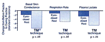 A comparison (meta-analysis) of 31 previously conducted research studies showed that the experience of Transcendental Consciousness (as experienced during practice of the Transcendental Meditation technique) produced a level of physical rest and relaxation many times deeper than eyes-closed resting. Basal skin conductance measures the ability of the skin to conduct electricity; electrical flow increases when the skin perspires due to nervous tension. Thus, the sharp reduction of basal skin conductance during Transcendental Consciousness indicates deep relaxation. Respiratory rate also goes down during a state of relaxation, as does plasma lactate, a chemical by-product of stress and tension. These physiological changes occur spontaneously as the mind effortlessly settles to Transcendental Consciousness—a state of inner peace. Although the body also experiences a type of relaxation in the sleep state of consciousness, there is a major difference. While in the sleep state the mind loses awareness altogether, during Transcendental Consciousness the body rests deeply, but the mind becomes more alert (and the brain wave patterns differ markedly). Thus, Transcendental Consciousness is sometimes termed by researchers a state of restful alertness.