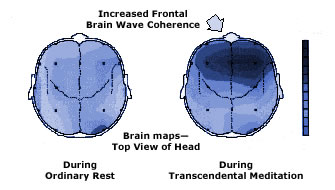 Twelve studies have shown that Transcendental Consciousness is also characterized by long-range coherence in brain wave patterns, as measured by electroencephalography (EEG). Ordinarily, during the waking state of consciousness, EEG patterns are scattered, disorderly, and rapidly changing. As the mind settles to Transcendental Consciousness, by contrast, brain waves tend to become rhythmic and orderly, and to move synchronously over large areas in the frontal regions of the brain (as shown here), extending eventually toward the posterior regions as well.